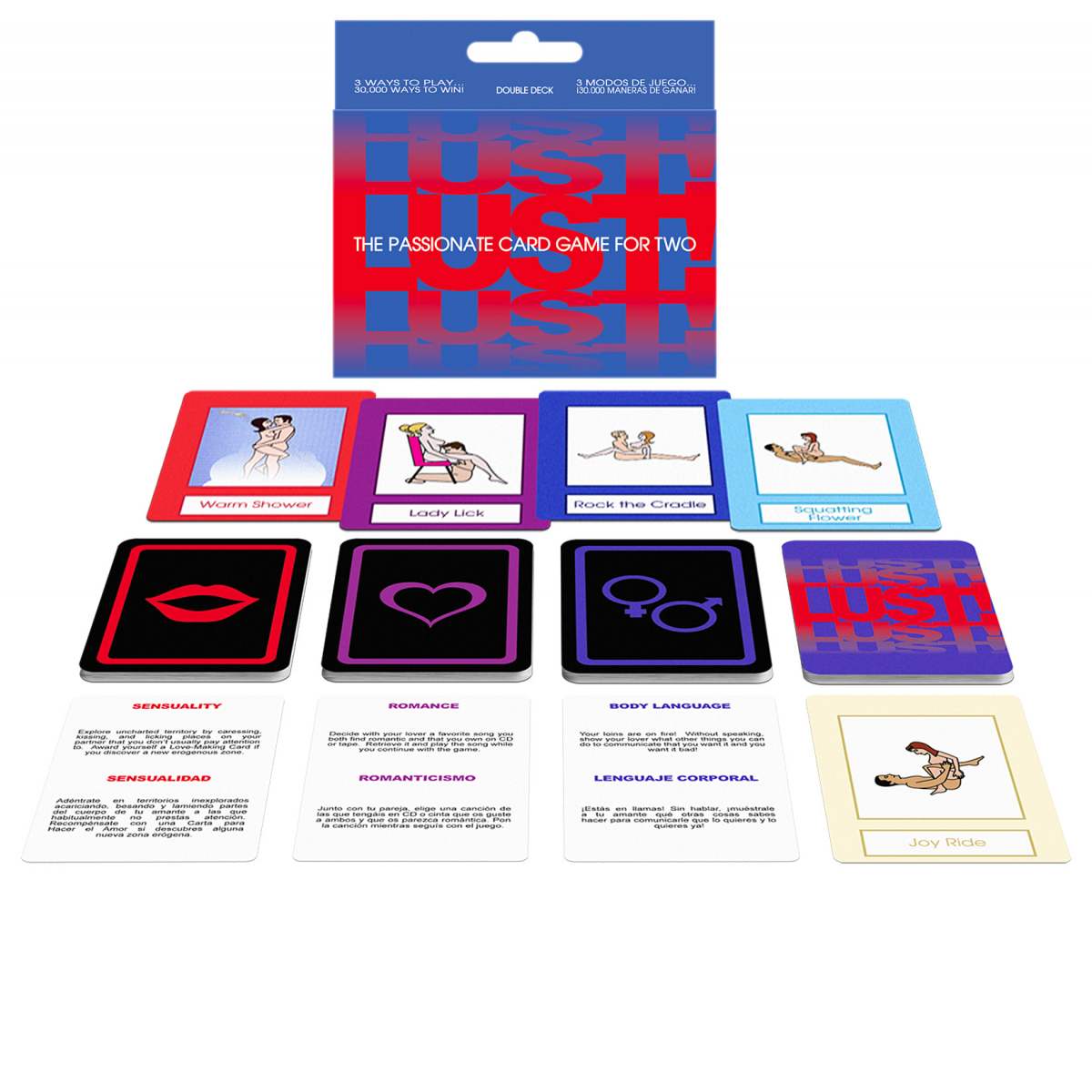 Het Lust! Kaartspel is een erotisch kaartspel van het populaire bordspel Lust! Bordspel. Het seks kaartspel is een spel speciaal ontworpen voor koppels. Met dit spel verkennen jullie zowel nieuwe romantische als lichamelijke intimiteiten met elkaar. De vrij-kaarten illustreren zowel een voorspel activiteit als een sekspositie. Jullie gebruiken deze kaarten om de seksuele fantasie op te bouwen.